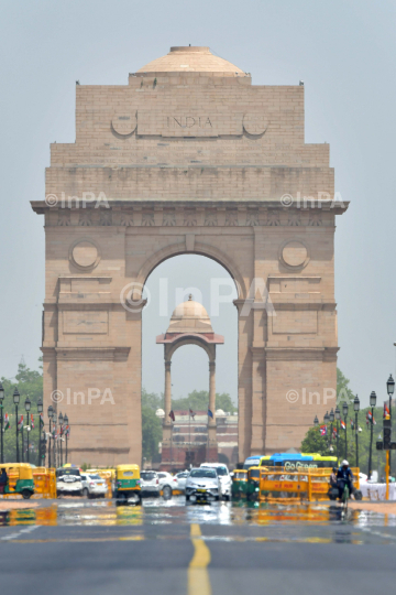 Vehicle move as heat causes a mirage on Rajpath, the road leading to the India Gate, in New Delhi, India, on April 20, 2017. Hot weather conditions prevailed across many parts of India. Photo Credit: Indian Photo Agency (InPA)