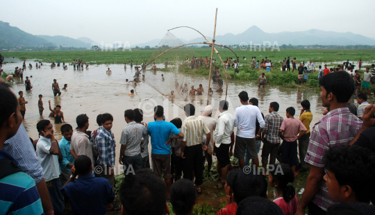 Hundreds of people thronged near a swamp at Chachal in Guwahati on Monday 25th June 2012, to collect currency notes of Rs 1,000 and Rs 500 which were found floating in the swamp, as the news about the currency notes spread, people in the area thronged the spot. People were seen fishing out currency notes of Rs 1,000 and Rs 500 from the swamp near the Ginger Hotel in Chachal. Some people even came prepared with fishing nets to check deep into the swamp for the wet currency notes. Photo by Ujjal Deb/Indian Photo Agency