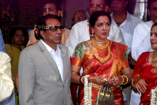 Bollywood actor Dharmendra with his wife and actress Hema Malini during Esha Deol's wedding with businessman Bharat Takhtani in Mumbai, India on June 29, 2012. Photo Credit: Indian Photo Agency