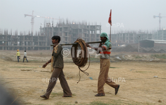 Noida Real Estate: Construction labour at Construction site in Noida, Uttar Pradesh, India. Last year, farmers' protest on land acquisitions prompted the Supreme Court to cancel the construction of residential flats in Noida Extension. Photo Credit: Indian Photo Agency