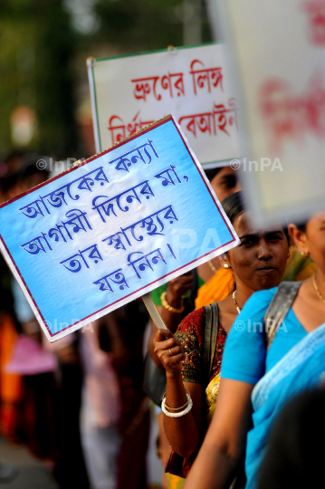 Women holds a banner to prevent determination of sex during a rally by Social welfare department to mark International Women's Day on the eve at Agartala, Tripura on March 7, 2012. Picture by Arindam Dey/Indian Photo Agency