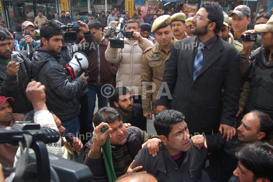 Activists of youth wing of Peoples Democratic Party (PDP) during a protest demanding a thorough probe in the multi-crore scam in Jammu and Kashmir Cricket Association (JKCA) also demanded action should also be taken against JKCA president Dr Farooq Abdullah and Common Wealth Game (CWG) chairman Suresh Kalmadi, in Srinagar on on March 16, 2012. Photo By Tariq Mir/Indian Photo Agency