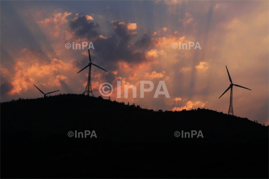 Enron & Zindal Windmills (tower, turbine, warming, white, wind, windfarm, windmill, windpower) stand on the outskirts of Chitradurga, Karnataka, India, Saturday, March 24, 2012. Photo Credit: Indian Photo Agency