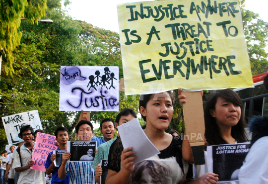 Students from the northeast take out a rally seeking justice for Loitam Richard in Guwahati, Assam, India on May 03, 2012. 19 years old Loitam from Manipur died in Bangalore on April 18 night after allegedly beaten by two of his hostel mates. He was an Architecture Engineering first year student of the Acharya NRV School of Architecture, Bangalore. Photo by Dibyajyoti Rabha/Indian Photo Agency