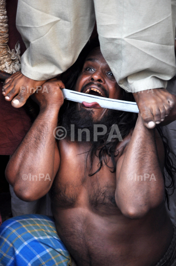A Sufi Kalandar (wandering ascetic) performs an act of self torture during devotion at the annual Urs (death anniversary) of Sufi saint Khwaja Moinuddin Chishti in Ajmer, Rajasthan, India on May 21, 2012. The Urs is observed to mark the death anniversary of the saint, known for his philosophy on religious tolerance. Photo by Himanshu Sharma/Indian Photo Agency