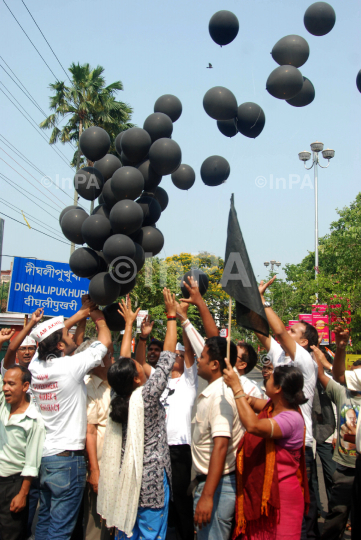 Activists of Krisak Mukti Sangram Samiti (KMSS) and India against corruption releasing black balloon as protest against the visit of UPA chairperson Sonia Gandhi and against the construction of big dams in Guwahati on Saturday 26th may 2012. Photo by Dasarath Deka/Indian Photo Agency