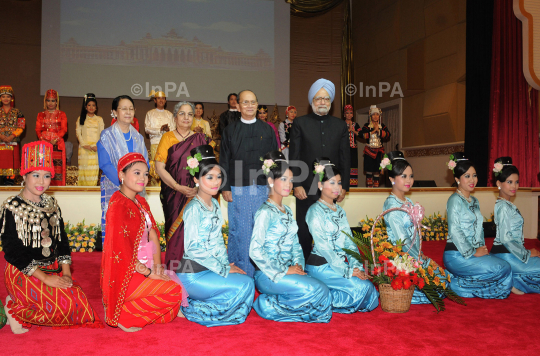 Indian Prime Minister, Dr Manmohan Singh and his wife Gursharan Kaur, the President of Myanmar, Thein Sein, and the first lady with the artists at the cultural programme, during the dinner banquet, at Presidential Palace, in Nay Pyi Taw, Myanmar on May 28, 2012. Photo Credit: Indian Photo Agency