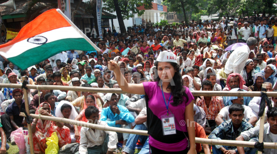 An Indian girl with national flag (Tiranga) during a public meeting of RTI activist and Team Anna core committee member Arvind Kejeriwal at Lakhidhar Borah khetra against the construction of big dams in Guwahati,Assam on Monday 28th may 2012. Photo by Dasarath Deka/Indian Photo Agency