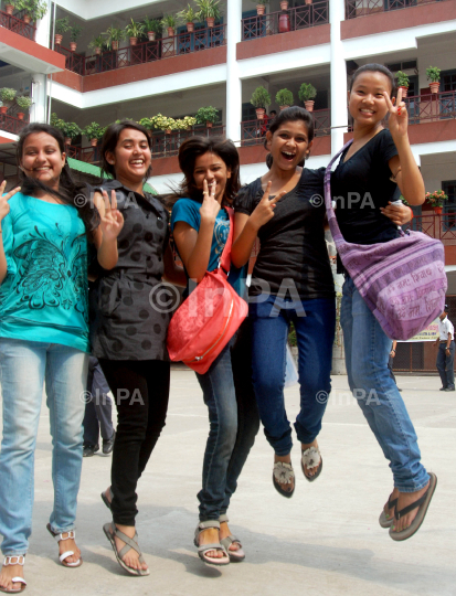 Successful CBSE class XII students, girls of Guwahati shows victory sign after their result were declared all over India today at Don Bosco Panbazar in Guwahati on Monday 28th may 2012. Photo by Dasarath Deka/Indian Photo Agency