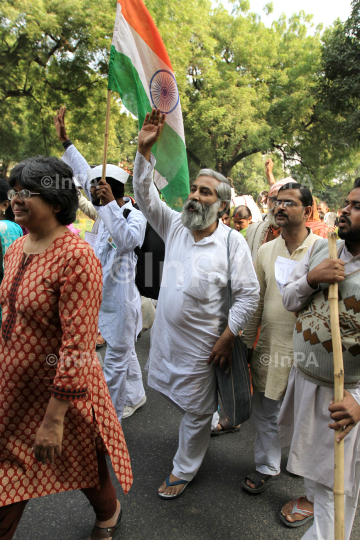 Indian social activist Sandeep Pandey and Kavita Srivastava during a protest ëKhali Thalií rally (Empty Plate Rally) after launching the Roti Bhaat Satyagrah demanding a universal PDS held by the Right to Food Campaign at Jantar Mantar in New Delhi on 01/11/2011. Photo Credit: Indian Photo Agency