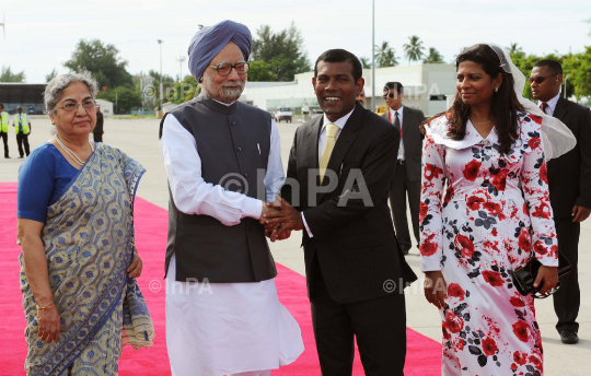 Prime Minister, Dr. Manmohan Singh and his wife Gursharan Kaur being welcomed by the President of Maldives, Mohamed Nasheed and his wife Nasheed, on their arrival at Gan International Airport, to attend the 17th SAARC Summit, in Maldives on November 09 2011. Photo Credit: Indian Photo Agency