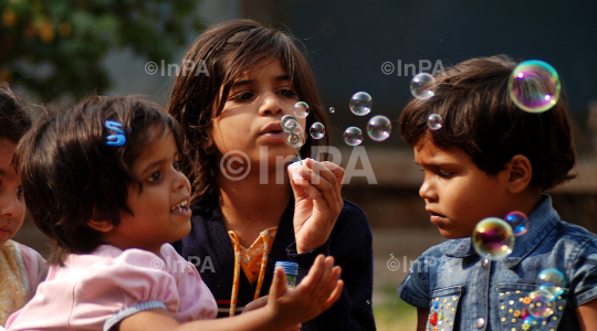 Orphan children enjoying with bubbles in Raj kumari baai baal niketan campus on the Children's Day in Jabalpur in Madhya Pradesh , India, 14/11/2011. Photo by Deepak Mishra/Indian Photo Agency