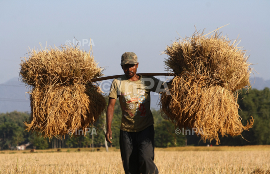 An Indian farmer carries bunches of cut straw rice from a paddy field on the outskirt of Dimapur, India’s north eastern state of Nagaland on, November 26, 2011. Indian is the second largest producers of rice in the world after China. Photo by Caisii Mao/Indian Photo Agency