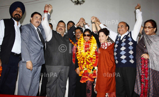 Peoples Democratic Party (PDP) District President, Dr Shamshad along with hundreds of PDP members joined National Conference in presence of the Advisors to the Chief Minister, Mubarak Gul and Devender Singh Rana at a public meeting at Jammu in Jammu and Kashmir on 28/11/2011. Photo by Amit Sharma/Indian Photo Agency