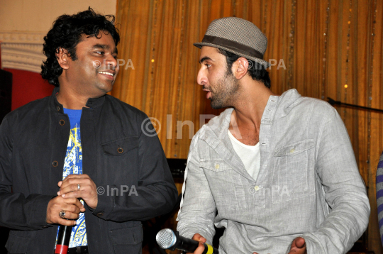 Bollywood Music Director AR Rahman with Actor Ranbir Kapoor during the promotion of film Rockstar in Mumbai on 29/10/2011. Photo Credit: Indian Photo Agency
