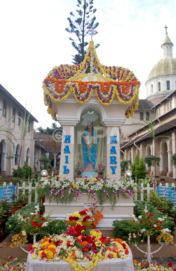 The Feast of Blessing of New corns-Nativity of our Lady íMonthi Festí was celebrated with much pomp and colour, with hundreds of children and adults alike showering flowers on the statue of the Nativity of Mother Mary to mark the Birth Day of the Blessed Virgin Mary at the Rosario Church in Mangalore on Saturday, September 08, 2012. Photo by RK Bhat/Indian Photo Agency