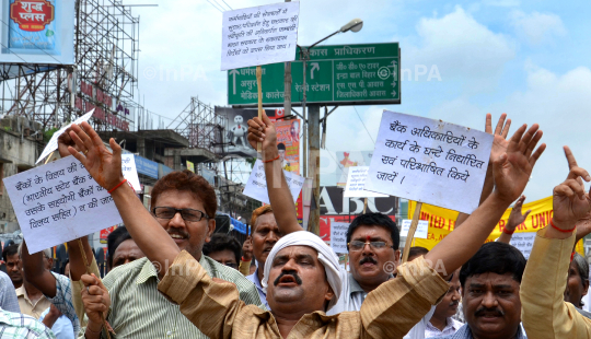 Bank employees and officers protesting against the UPA Government's ëreforms' policies in the banking sector in Gorakhpur, Uttar Pradesh on 05/08/2011. Photo by Abhinav/Indian Photo Agency