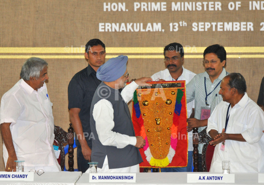 Indian Prime Minister, Dr Manmohan Singh being presented a memento by the KUWJ General Secretary, Manoharan Morayi, at the inaugural function of the Golden Jubilee Celebrations of the Kerala Union of Working Journalists, in Kochi on September 13, 2012. Chief Minister of Kerala, Oommen Chandy and the Defence Minister, AK Antony are also seen. Photo Credit: Indian Photo Agency