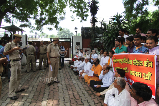 Several members of Hindu Raksha Dal sitting on a dharana to protest against Azam Khan and Mulayam Singh Yadav for bad law and order situation in Uttar Pradesh at the residence of Samajwadi Party chief Mulayam Singh Yadav in New Delhi, India, Wednesday, Sept. 19, 2012. Photo Credit:Indian Photo Agency