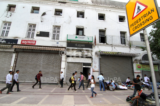 Pedestrian walks at a closed market in connaught place during a nationwide strike against FDI in retail and proposed six LPG cylinders for each household in a year in New Delhi, India, Thursday, Sept. 20, 2012. Angry opposition workers have disrupted train services as part of a daylong strike in India to protest rising diesel prices and the government's decision to open the country's huge retail market to foreign companies. Photo Credit: Indian Photo Agency