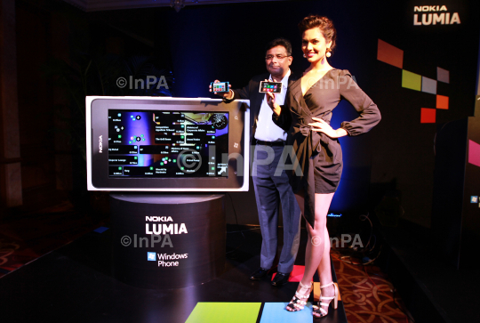 Bollywood actress Esha Gupta with V Ramnath, Director Marketing, Nokia India at the launch of Nokia Lumia, smartphones based on Windows Phone in New Delhi on Sept. 25, 2012. Photo Cedit: Indian Photo Agency