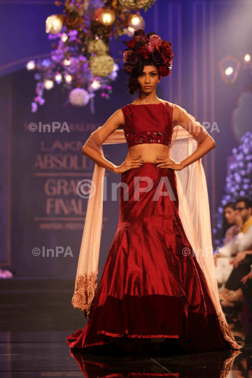 Model Lakshmi Rana poses showcasing designer Manish Malhotra's "Gloss" collection during the grand finale of Lakme Fashion Week Winter Festive 2014 in Mumbai on Sunday, 24 August 2014. Photo by Indian Photo Agency (InPA)