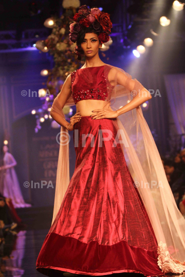 Model Lakshmi Rana poses showcasing designer Manish Malhotra's "Gloss" collection during the grand finale of Lakme Fashion Week Winter Festive 2014 in Mumbai on Sunday, 24 August 2014. Photo by Indian Photo Agency (InPA)