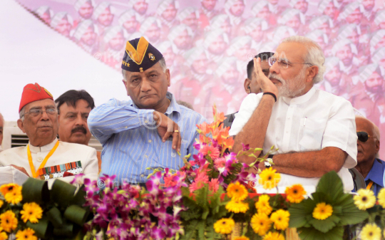 BJP's prime ministerial candidate and Gujarat chief minister Narendra Modi with Retired Army chief General VK Singh during a rally of ex-servicemen, in Rewari, Haryana, India, Sunday, Sept.15, 2013. He addressed his maiden rally after being named the BJP's prime ministerial candidate. Photo Credit: Indian Photo Agency (InPA)