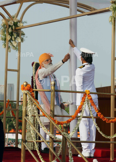75th Independence Day Celebration: Prime Minister Narendra Modi unfurls national flag during Independence Day celebrations from the ramparts of the historic 17th century Red Fort in New Delhi, India, on August 15, 2021. Addressing the nation from Red Fort in Delhi, Prime Minister Narendra Modi lauded the Tokyo Olympic winners and Covid warriors. Photo credit: Indian Photo Agency (InPA)