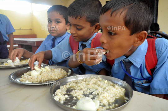 Mid-day meal: Indian school girl and boys eat free midday meal at Umakanta Academey government school in Agartala, Tripura, India, on Tuesday, 27th August 2013. The Indian government last month decided to come out with an ordinance to give two-third of the nation's population the right to 5 kilograms of food grains every month at a highly subsidized rate of 1-3 rupees per kilogram, which, if implemented, will be the largest food security program in the world, 26th August, 2013, Food security bill passed in Loksabha. Photo by Abhik Deb/Indian Photo Agency (InPA)
