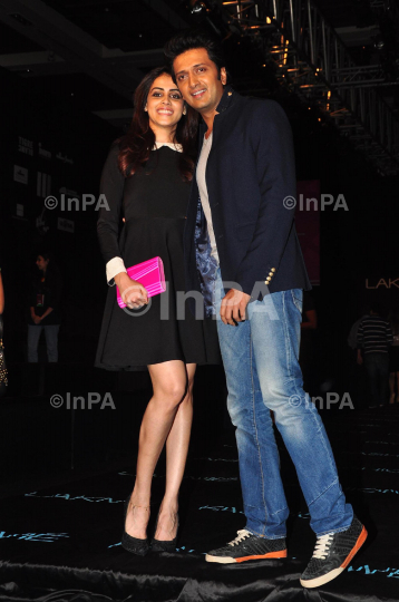 Bollywood actors Ritesh Deshmukh with Genelia D'souza during the Lakme Fashion Week Winter/ Festive 2013 in Mumbai, India on August 25, 2013. Photo Credit: Indian Photo Agency (InPA)