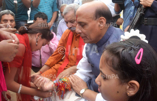 Girls tying ''Rakhi'' to the BJP National President, Rajnath Singh at his residence on the occassion of Raksha Bandhan in New Delhi, India on Aug 21, 2013. Photo Credit: Indian Photo Agency (InPA)