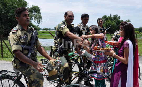 Indian girl tying Rakhi to Border Security Force (BSF) Jawans during Raksha Bandhan Celebrations with BSF Jawans organized by Bright Academy School children at India-Bangladesh border, Fulbari BOP near Siliguri, West Bengal, Inda on Sunday, August 18, 2013. photo Lila Sah/Indian Photo Agency (InPA)