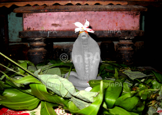 A clay model of cobra at a temple for workshop during Naga Panchami in Pune, India on Aug 11, 2013. Nag Panchami is a festival during which Hindus in some parts of India worship live Nāgas (cobras) or images of them. Photo by Amey Nazare/Indian Photo Agency