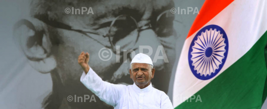 Social activist Anna Hazare sits in the backdrop of a portrait of Mahatma Gandhi at the venue of a public hunger strike in New Delhi, India, Friday, Aug. 19, 2011. Hazare began the strike and mass protest Friday, adopting the tactics of liberation hero Mahatma Gandhi to push for government reform. Photo Credit: Indian Photo Agency