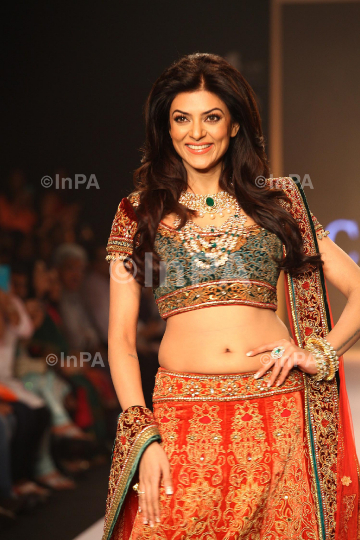Bollywood actress Sushmita Sen walk the ramp displaying the Charu Jewels collection at the India International Jewellery Week (IIJW) in Mumbai, India on August 06, 2013. Photo Credit: Indian Photo Agency (InPA)