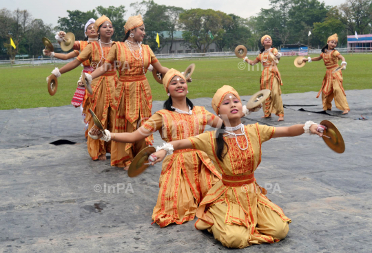 Artist in traditional attire perform during opening Ceremony OIl India 37th All Assam Inter District Athletics Championship 2013 Organised by Duliajan Sports Association at Neharu Maidan Duliajan, in Dibrugarh District, Assam, India on April 04, 2013. Photo by Manash Pratim Gogoi/Indian Photo Agency (InPA)