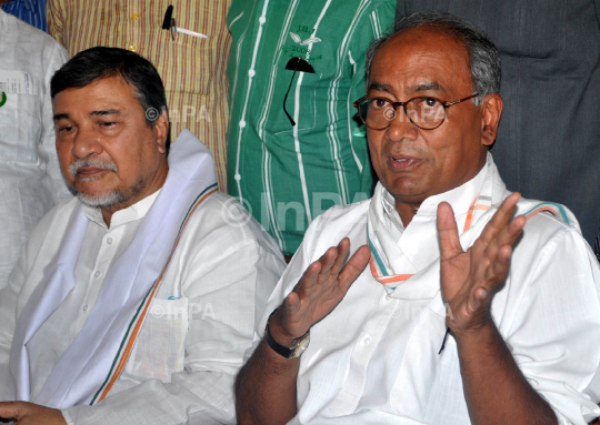 Congress General Secretary Digvijay Singh addressing the media in Guwahati on Thursday 4th April 2013. Assam Pradesh Congress Committee president Bhubaneswar Kalita, is also seen in the picture. Photo by Dasarath Deka/Indian Photo Agency (InPA)