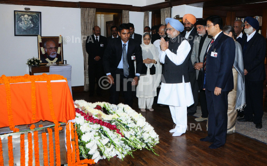Prime Minister Manmohan Singh with wife Gurusharna Kaul paying thier last respect to the mortal remains of former Prime Minister I.K Gujral in new Delhi on saturday.