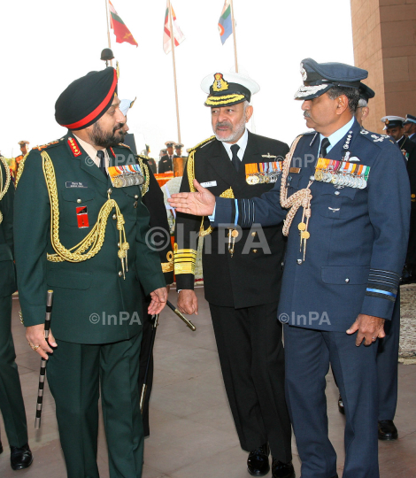 Tri Service Chiefs after paying homage at Amar Jawan Jyoti, India Gate on the occasion of Navy Day in New Delhi on December 04, 2012.