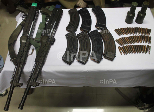 Two ulfa cadres Bedanta Nath and Sargent major Bhaskar nath whose were involved in the 26th september bomb blast in Sivasagar, surrendered today at Sivasagar SP office. In the picture seen the guns and other equipment which are hand over in the hand of Akhilekh kr Singh, SP of Sivasagar on 07 Dec 2012. Photo by Luit Chaliha.