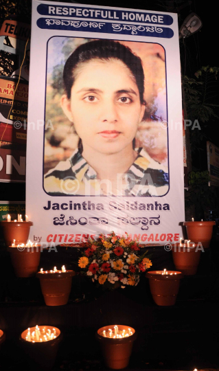 Students and common people participated in a candle light rally to pay respect nurse Jacintha Saldanha, in a peaceful rally on the busy street in Mangalore on 12 Dec 2012. Jacintha Saldanha, died in 'unexplained circumstances' at London on December 7 after she became victim of a 'Royal Hoax' perpetrated by RJs Mel Grieg and Michael Christian of 2Day FM Radio of Australia. Photo by RK Bhat/Indian Photo Agency