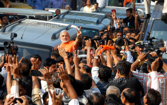 Gujarat Chief Minister Narendra Modi after casting his vote at a polling station in Ahmedabad, Gujrat, India on Monday, Dec 17, 2012. The counting of votes will be on December 20. Photo Credit: Indian Photo Agency