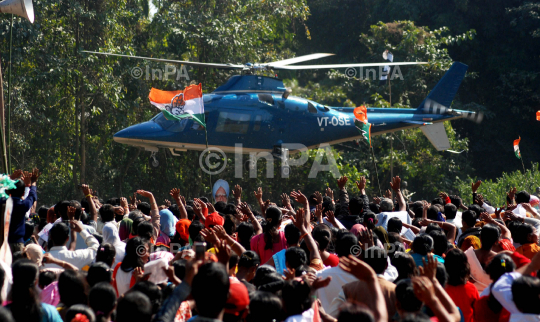 Villagers wades towards the helicopter as Tarun Gogoi chief minister of Assam leave the place after campaigning for the 2nd phase of Panchayat Election 2013 at Netiyananda Bridya Bhawan High School field at Pathsala under Barpeta district Assam on Saturday 2nd February 2013.Photo: DASARATH DEKA