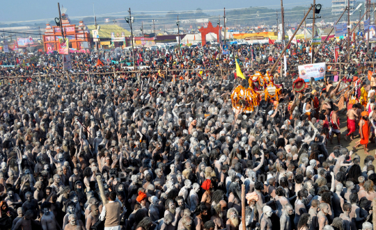 The Kumbh Mela, is the single largest religious gathering in the world, held at confluence of rivers Ganga and Yamuna in Allahabad it is called the “greatest show on Earth”. On the occassion of 'Mauni Amavasya' feb. 10, 2013 around 11 million people gathered on a single day for a ritual bath, which is almost double the population of Washington DC, and about 1% of India’s population. Over 3 months up to 100 million people will gather. Naked sadhus called Naga Babas are a special group that attract a lot of attention. Pilgrims .. Photo By - Deepak Mishra