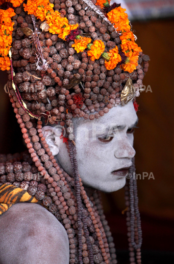 A Naga Sadhu, or naked Hindu holy man, dressed in beads