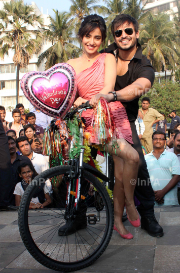 Bollywood actors Vivek Oberoi and Neha Sharma during the promotion of Bollywood crime romance film "Jayantabhai Ki Luv Story" in Mumbai, India on February 13, 2013. Photo Credit: Indian Photo Agency (InPA)