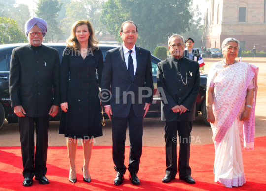 Indian President, Pranab Mukherjee and the Prime Minister, Dr Manmohan Singh with the President of the Republic of France, Francois Hollande at his Ceremonial Reception, at Rashtrapati Bhavan, in New Delhi on February 14, 2013.
