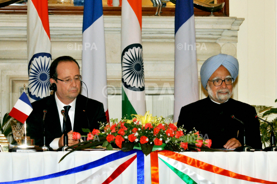 Indian Prime Minister, Dr Manmohan Singh with President of the Republic of France, Francois Hollande, at the Joint Press Statement in New Delhi on February 14, 2013. Photo Credit: Indian Photo Agency (InPA)