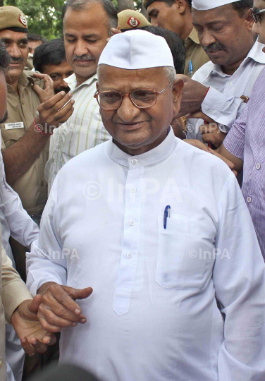 Social activists Anna Hazare speaking to mediapersons after a meeting with Congress President Sonia Gandni on the issue of Jan Lokpal Bill Draft at her residence in New Delhi on Saturday, 02/07/2011. Photo Credit: Indian Photo Agency